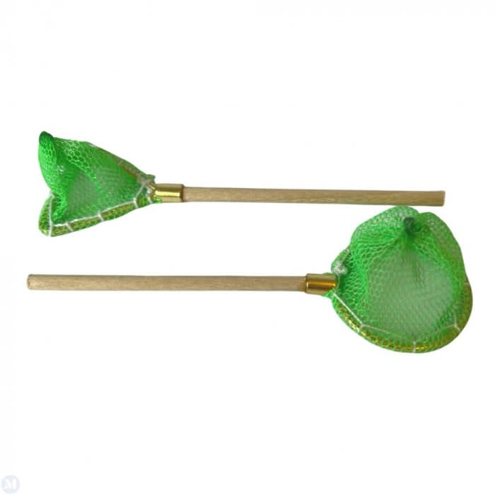 Two Fishing Nets with green nets & wooden handles, One net is triangular & the