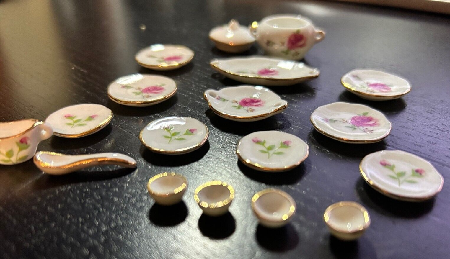 Pink Rose Dinner Set Dolls House Miniature 1:12 Scale Pot, Dining, Porcelain Tea